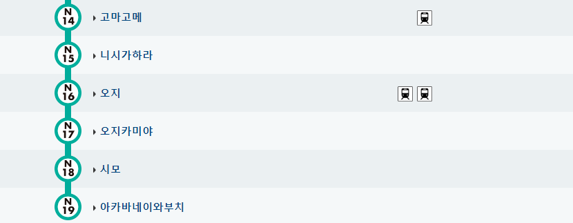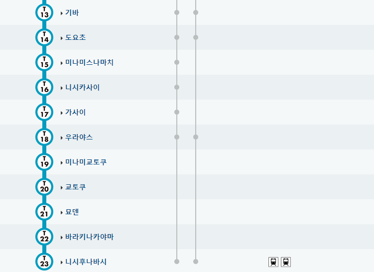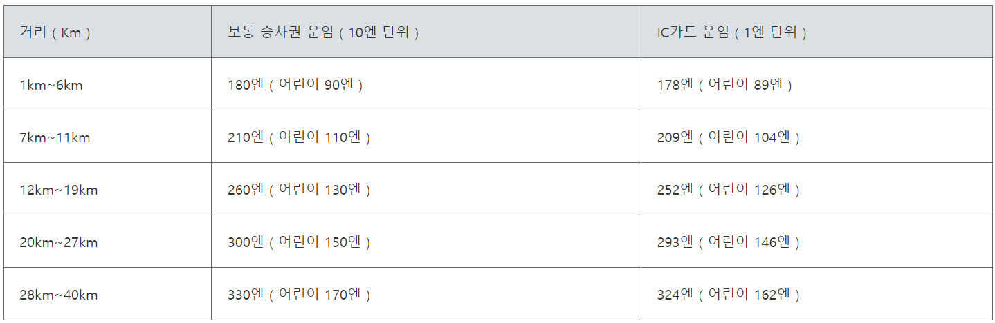보통 승차권 : 보통 승차권은 각 역의 발매기에서 구입하실 수 있습니다. 발매 금액은 180엔, 210엔, 260엔, 300엔, 330엔입니다. 승차 구간에 해당하는 운임의 승차권을 구입하여 주시면 됩니다.