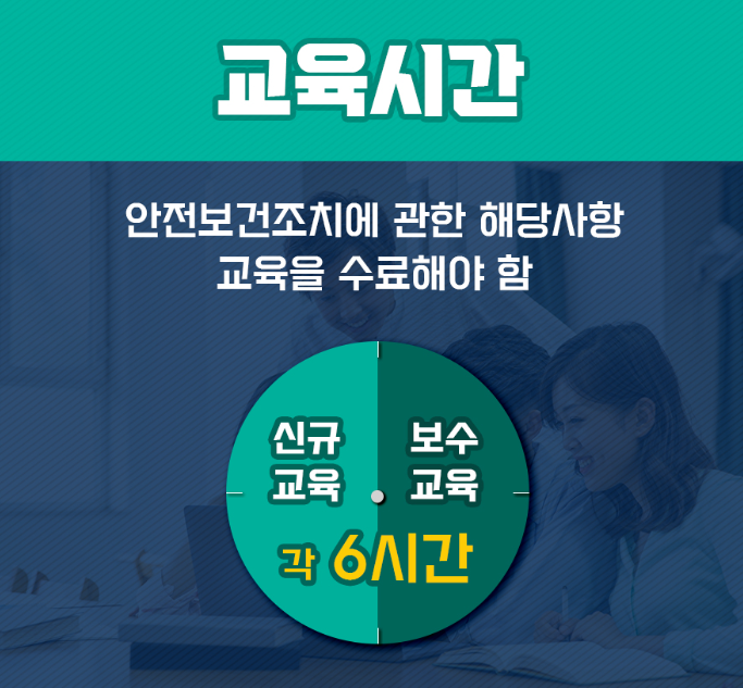 안전보건관리 책임자는 각 산업안전보건법령 및 안전보건조치에 관한 교육을 신규교육 6시간 이상, 보수교육 6시간 이상 이수해야 합니다. 안전보건관리 책임자는 사업장의 안전과 보건 관리를 총괄 관리하는 사람으로 산업안전보건법 제32조 및 시행규칙 제29조에 따라 직무교육을 반드시 이수해야 합니다.