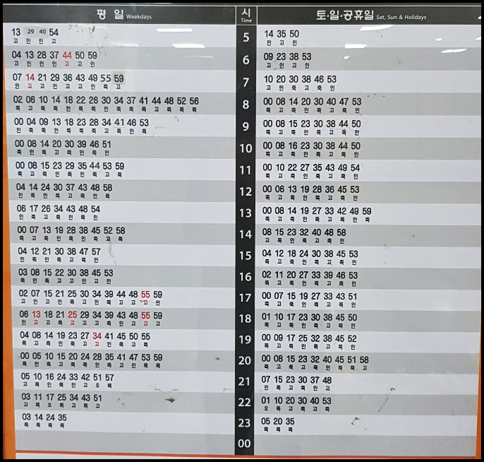 | 20시 | 20시 00분 죽전 20시 05분 인천 20시 10분 죽전 20시 15분 고색 20시 20분 죽전 20시 24분 죽전 20시 28분 인천 20시 35분 죽전 20시 41분 고색 20시 47분 인천 20시 53분 죽전 20시 59분 죽전 |