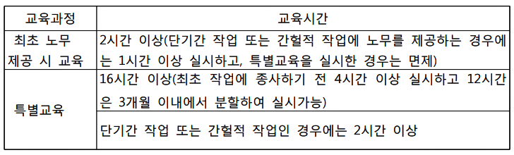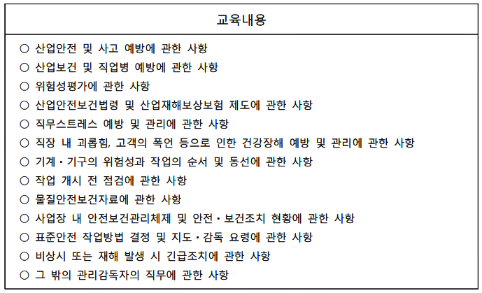 | 관리감독자 채용 시(8시간 이상) / 작업내용 변경 시(2시간 이상) 교육 |