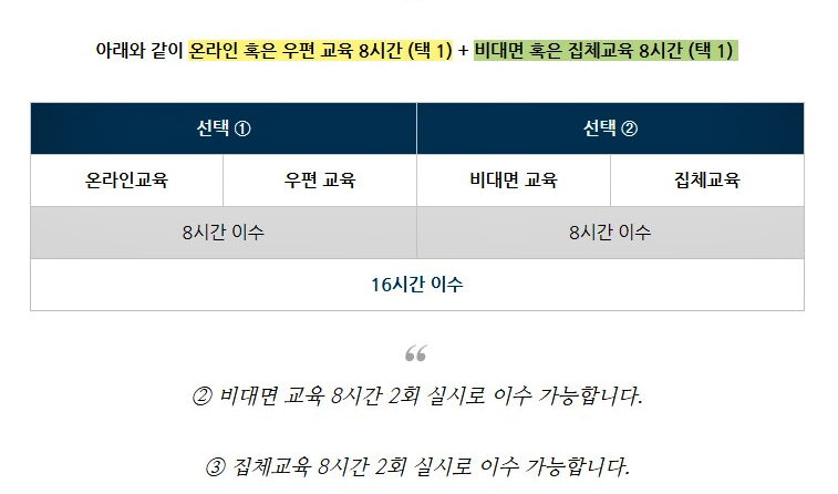 관리감독자 정기교육은 우편교육에 교육 인정 시간이 개정 전 집체교육과 동일하게 교육시간이 인정되었으나 개정 후 온라인교육 과정과 동일하게 총 이수시간의 2분의 1만 인정된다는 부분이 있습니다. 때문에 온라인, 우편교육 진행 시 반드시 시 교육 이수 시간의 반은 비대면 교육, 또는 집체교육을 함께 이수하셔야 됩니다.